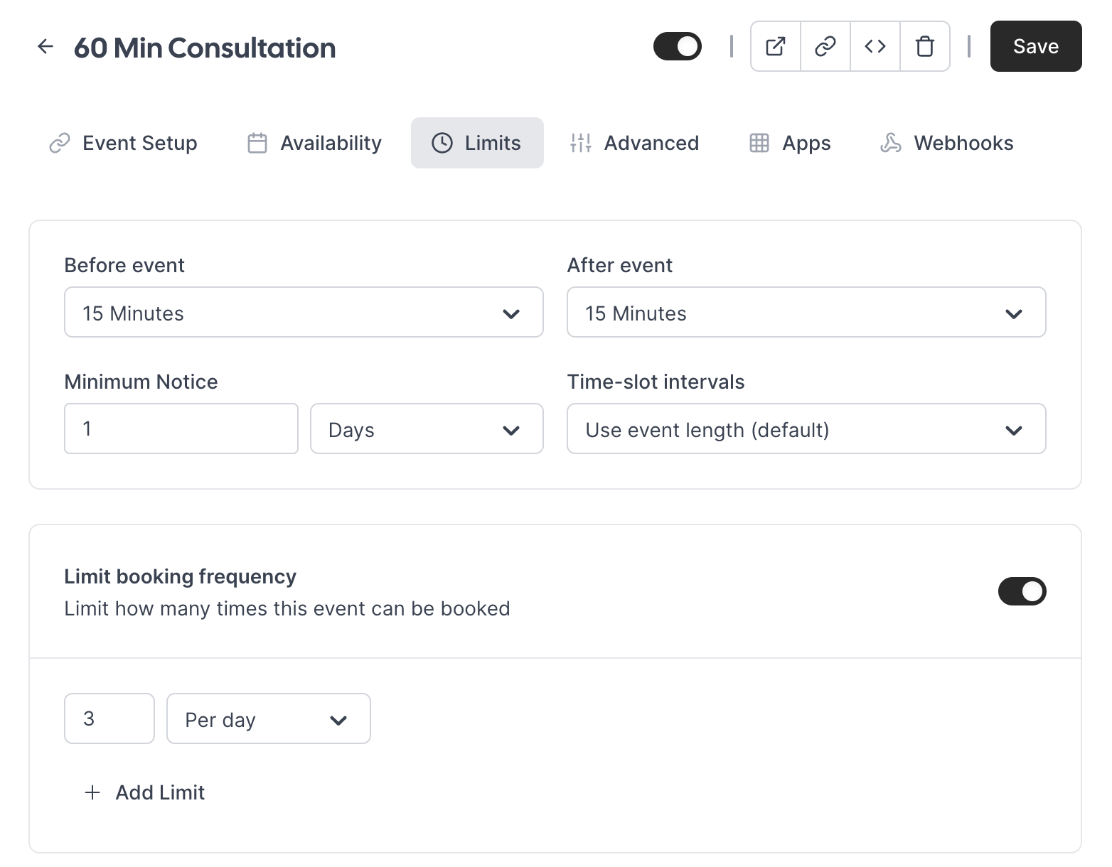 Set buffer times before and/or after appointments in the Limits section. These buffers help you manage transitions between sessions, allowing for preparation, travel, or a short break. Customize the buffer times for each event type to ensure you have the necessary time to prepare or decompress.