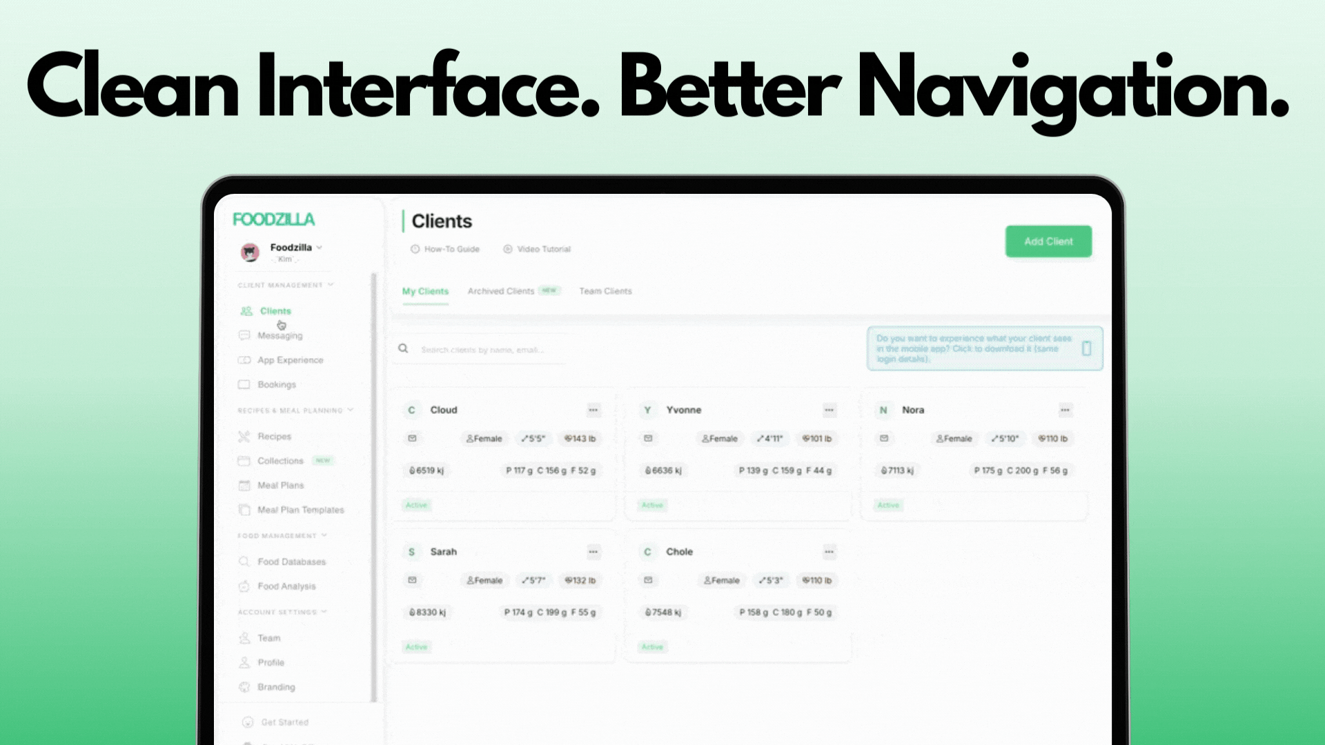 Restore previously deleted clients, set their language preferences, and see how nutrition targets are calculated β all before onboarding them.