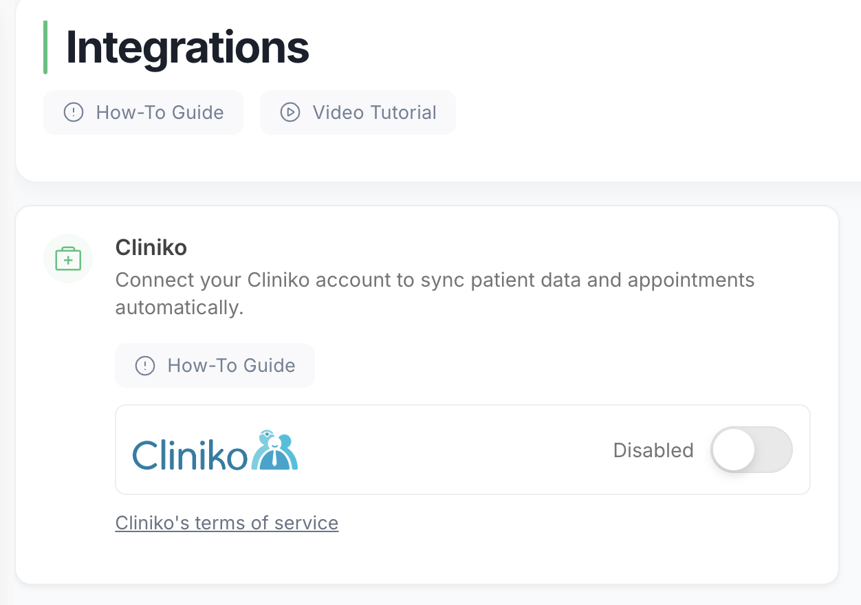 - Access Integrations: Navigate to the user menu, select "Integrations", and then toggle on Cliniko.