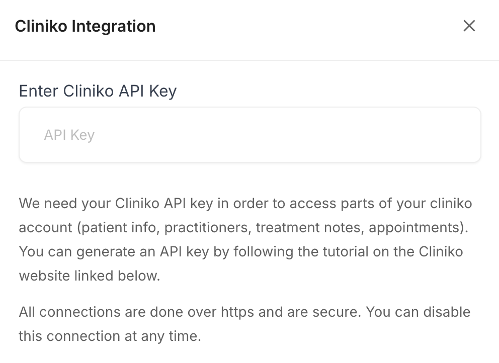 - Enter Your API Key: Input your Cliniko API key. Create an API key here if you don't have one.