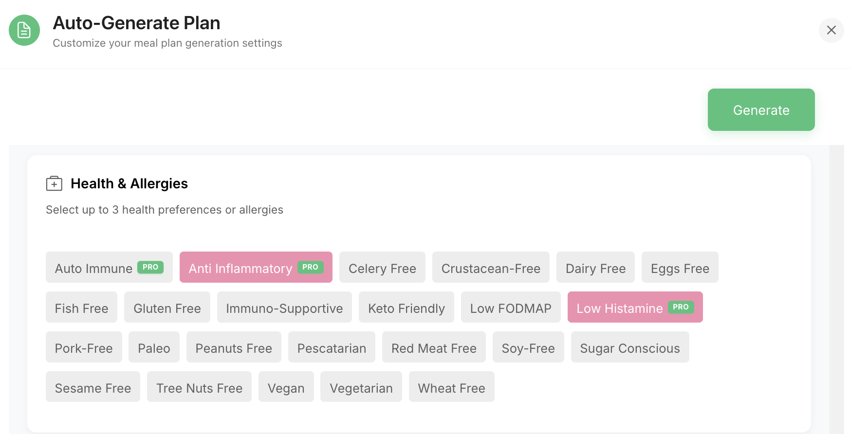 We’ve introduced two new health tags β€” Anti-Inflammatory and Low-Histamine β€” under Health & Allergies in your Auto-Generate Plan settings.