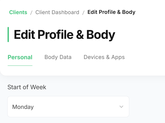 Start of week setting: Make sure the start day of the week matches between your account and your client's app. For example, if yours is set to Monday, their app should also be set to Monday rather than Sunday. A mismatch here can cause meals to appear on different days or look like they're missing.