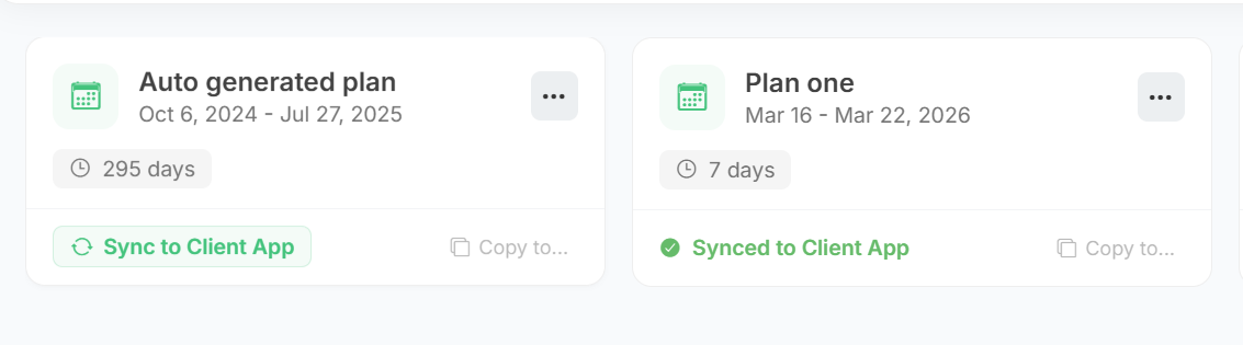 Meal plan sync status: Only one meal plan can be synced to the client app at a time. Head to the meal plans page for the affected client, where all their meal plans are listed, and make sure the one you want synced is actually the one showing "Synced to client app" with a checkmark. If it's not, just click the sync button on the correct meal plan card to sync it.