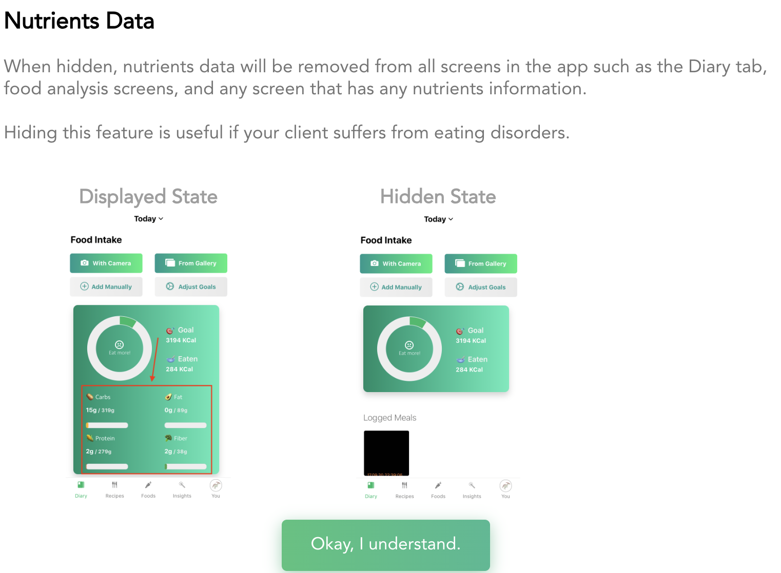 For example, hiding the calories will remove calories/kilojoules data from the app for your client(s) so they don't focus on macros or calories and is very useful for clients suffering from eating disorders.