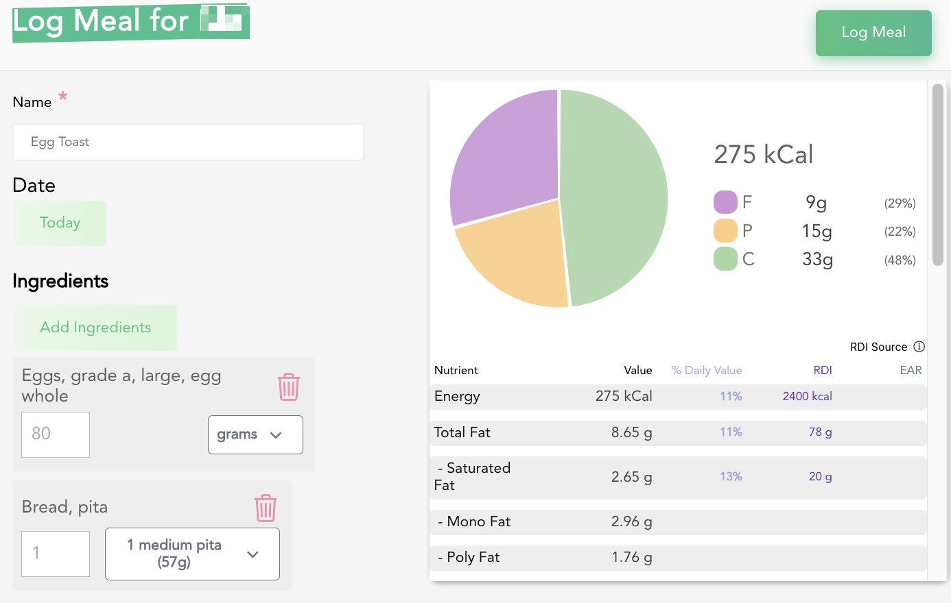 - Complete the Log: After entering the meal details, click the "Log Meal" button again to submit the information.