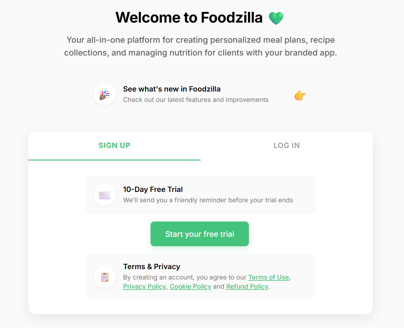 • Your trial lasts 10 days, giving you full access to most Foodzilla features.