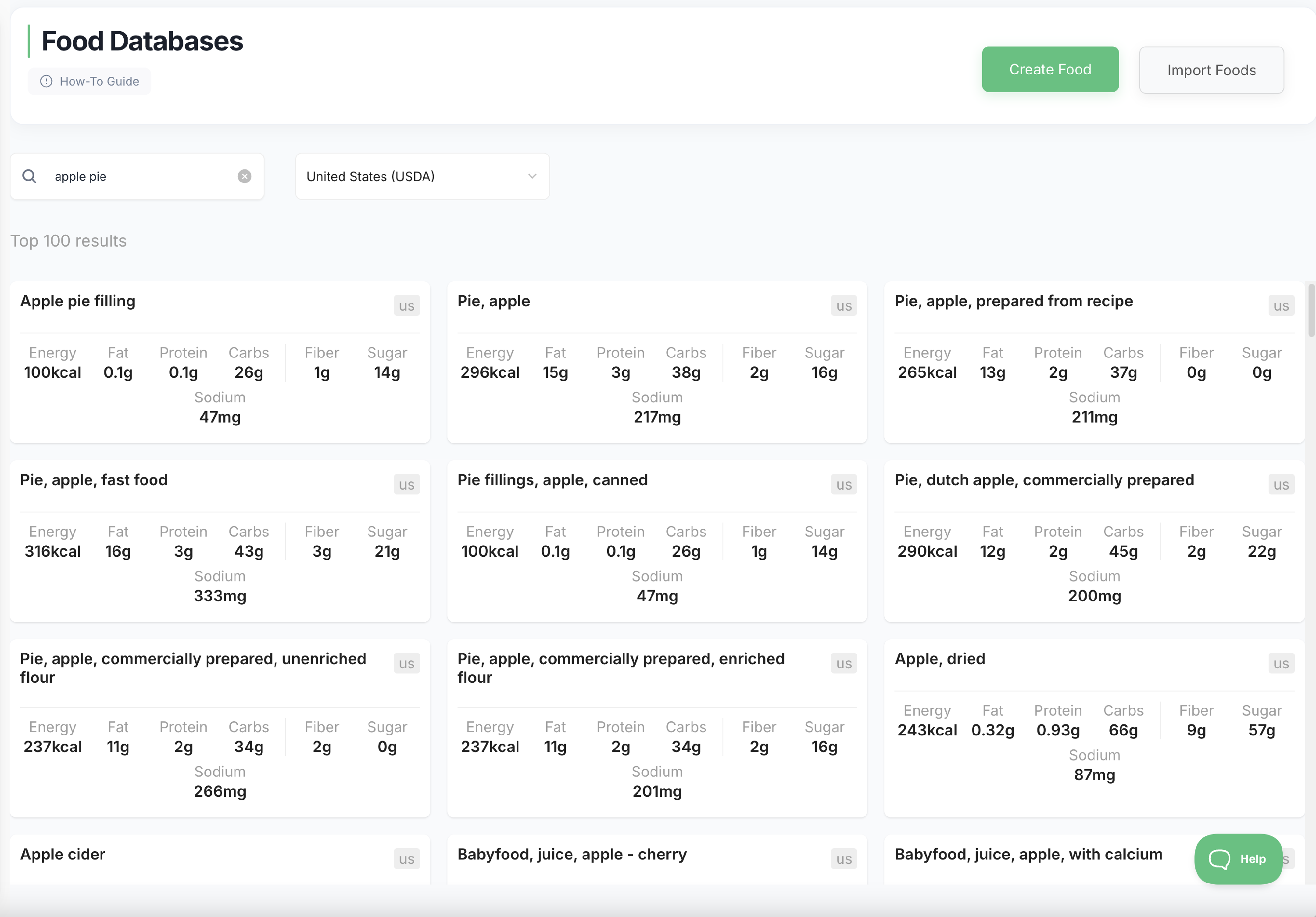 • Start typing the name of the food. For example, typing β€œApple Pie” will show results like this: