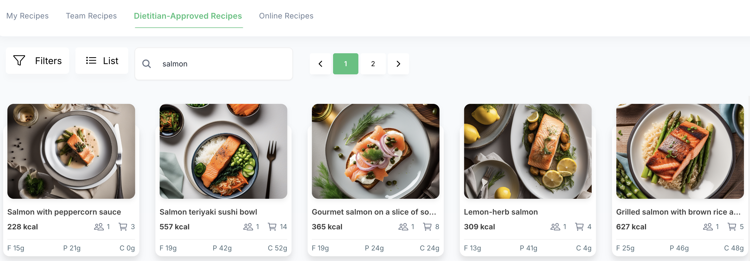 To search for recipes, select the database of your choice: My Recipes, Dietitian-Approved Recipes, Online Recipes, or Team Recipes (available with a team plan).
